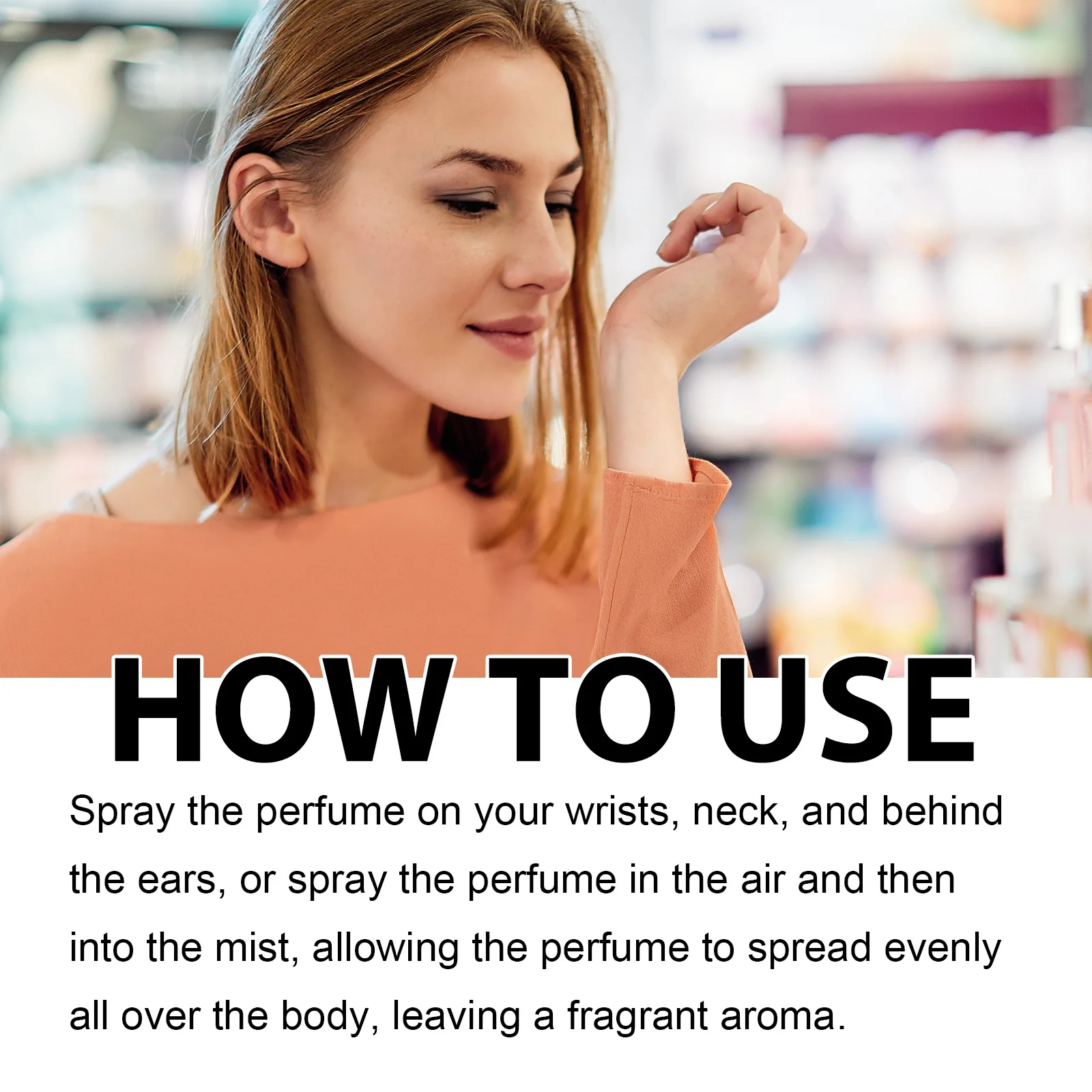 Spray the perfume on your wrists, neck, and behind the ears, or spray the perfume in the air and then into the mist, allowing the perfume to spread evenly all over the body, leaving a fragrant aroma.